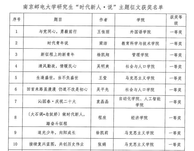 为深入贯彻学习党的二十大精神,培养担当民族复兴大任的时代新人,10月—11月期间,我校举办“时代新人·说”主题征文活动,各学院研究生积极响应,掀起“讲时代故事、发时代先声、做时代新人、树时代新风”的热潮,共收到征文129篇,评选出一等奖10名,二等奖14名,三等奖22名。
