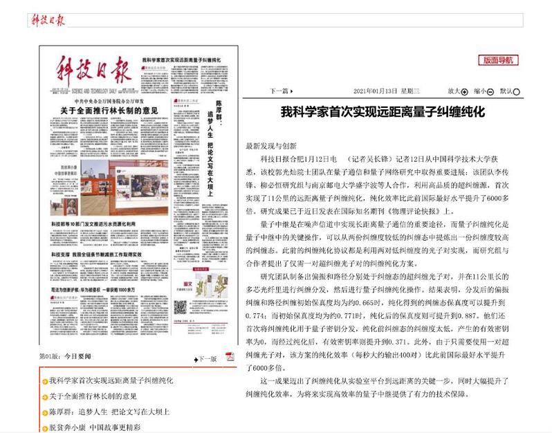 此前,该成果还被《人民日报》、《科技日报》头版、以及央视新闻等以“我科学家实现11公里远距离量子纠缠纯化”为题广泛报道。