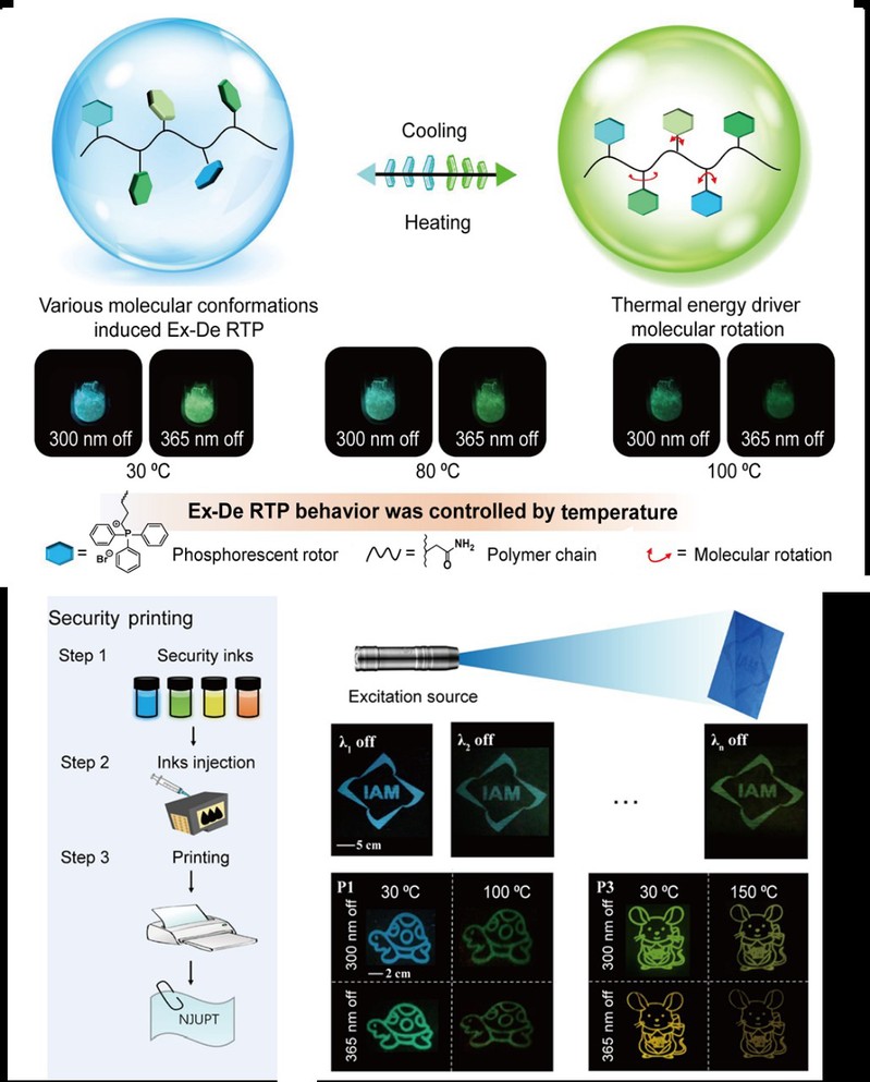 针对这一关键科学问题,黄维院士、赵强教授和马云教授带领的团队将磷光分子转子作为单体与丙烯酰胺进行共聚,发展了一系列有机室温磷光聚合物。由于磷光分子转子上的芳香基团能自由转动,它们在聚合物中会呈现不同的分子构像,这直接影响了每个磷光单体的三线态激发态性质。因此,制备的有机室温磷光聚合物在不同波长激发下显示不同的磷光发光颜色。进一步,通过外场热刺激驱动分子转子转动可以使磷光单体的分子构像发生变化,改变其激发波长依赖发光的响应行为,从而实现响应行为的动态调控。最终,团队成员探究了这类有机智能光电材料在光学信息防伪领域中的应用。该研究成果对发展响应行为可动态调控的有机智能光电材料具有重要的指导意义,同时也将促使这类材料在信息显示、信息安全、信息传感等光电领域取得突破性进展。