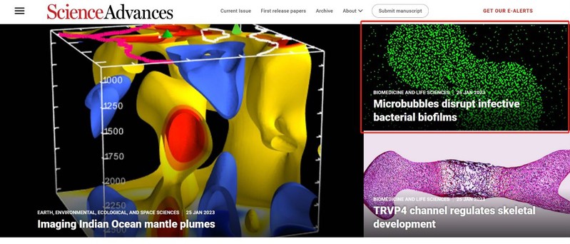 近日,南京邮电大学信息材料与纳米技术研究院、有机电子与信息显示国家重点实验室汪联辉教授、宇文力辉副教授和高宇副教授团队,发展了超声响应催化微泡用于铜绿假单胞菌慢性肺炎感染的治疗。相关成果近期以Ultrasound-responsive catalytic microbubbles enhance biofilm elimination and immune activation to treat chronic lung infections为题发表在国际顶级学术期刊Science Advances(《科学进展》),并入选当期杂志的Featured Image。材料科学与工程学院宇文力辉副教授、高宇副教授、汪联辉教授为共同通讯作者,博士研究生修尉峻为论文第一作者。