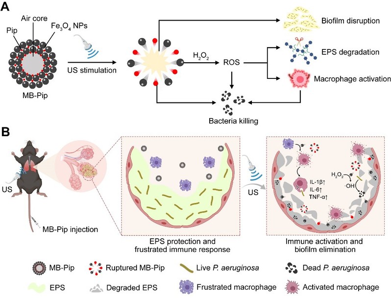 团队构建了由四氧化三铁纳米颗粒(Fe3O4 NPs)和抗生素哌拉西林(Pip)组成的超声响应载药催化微泡(MB-Pip)用于铜绿假单胞菌生物膜的清除。在超声作用下,MB-Pip产生惯性空化作用,通过机械效应扰乱生物膜结构,释放的Fe3O4 NPs可催化降解胞外基质,实现物理/化学双模式的生物膜破坏,有效增强药物的渗透和抗菌性能。此外,Fe3O4 NPs可激活巨噬细胞向M1表型极化,增强巨噬细胞的杀菌能力,实现小鼠铜绿假单胞菌慢性肺炎的高效治疗,为解决临床细菌生物膜感染难题提供了新的研究思路。