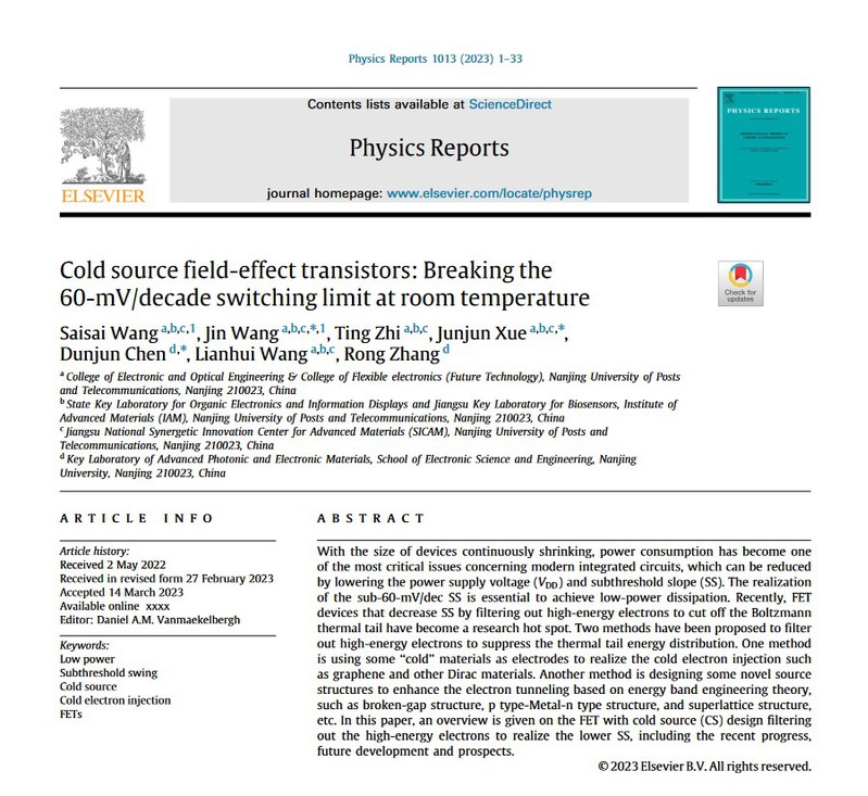 3月21日,我校电子与光学工程学院、柔性电子(未来技术)学院汪金副教授、智婷副教授、薛俊俊副教授低维化合物半导体器件研究组和南京大学陈敦军教授、张荣教授团队共同在Physics Reports上发表题为“Cold source field-effect transistors: Breaking the 60-mV/decade switching limit at room temperature”的综述文章(Physics Reports, 1013 (2023) 1-33)。汪金副教授、薛俊俊副教授和陈敦军教授为共同通讯作者,研究生王赛赛和汪金副教授为论文第一作者,南京邮电大学为论文第一单位。