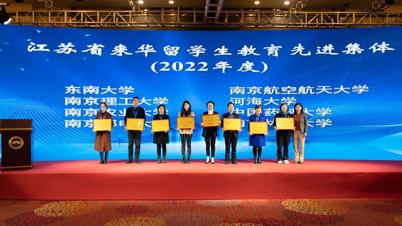 我校荣获2022年度“江苏省来华留学生教育先进集体”荣誉称号(右三)