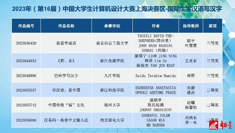 7月20日,2023年(第16届)中国大学生计算机设计大赛上海决赛区暨国际生“学汉语,写汉字”大类国赛结果公布,我校国际学生Aminul、Shawon、Atia(孟加拉籍)组成的“南邮孟之队”凭借“古文-UnilM:基于预训练模型的古代现代汉语机器翻译”项目获得国家级二等奖,国际学生Ashraful、Sagor、Badsha(孟加拉籍)组成的“邮梦有孟队”凭借“汉易码一高效中文输入法”项目获得国家级三等奖。