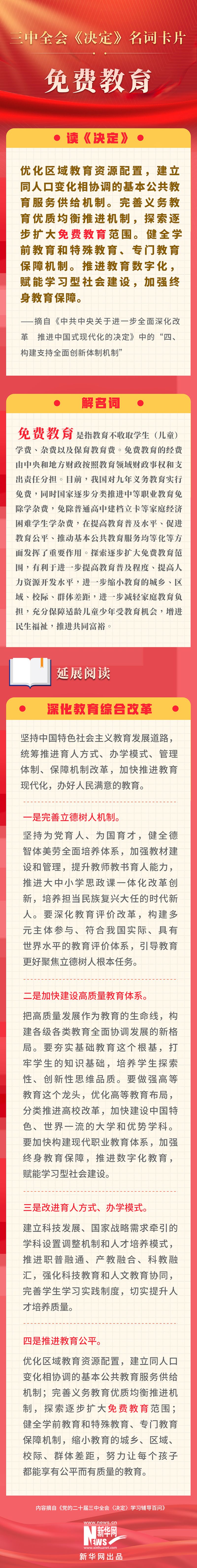 党的二十届三中全会审议通过了《中共中央关于进一步全面深化改革、推进中国式现代化的决定》。新华网依据《党的二十届三中全会〈决定〉学习辅导百问》,制作三中全会《决定》系列名词卡片,和大家一起来深入学习领会二十届三中全会精神。本期名词是“免费教育”。